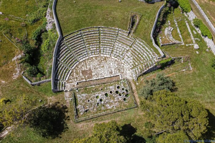 Vicino ad Palazzolo Acreide si trova Akrai, colonia fondata dai Siracusani nel 664 a.C. Meno nota di altre, è una tappa preziosa per chi cerca autenticità. Qui il teatro greco è intimo, delicato, scavato nella pietra bianca. Non ha la monumentalità di Siracusa o Taormina, ma offre qualcosa di diverso: l’incanto del silenzio. Guardandolo, è facile immaginare gli abitanti di Akrai che assistevano alle commedie di Menandro mentre le colline si tingevano d’oro. Accanto al teatro si trova una necropoli rupestre e l’enigmatico luogo chiamato “I Santoni”, un complesso di rilievi votivi dedicati alle divinità ctonie, unico nel panorama siceliota.